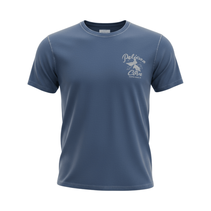 Vorne ein kleiner, ruhiger „Pelican Cove“-Print; hinten das große Motiv im Retro‑Stil. Ein Maritim‑Diner‑Feeling mit Augenzwinkern: Der Pelikan kocht lieber, als laut zu schreien – genau richtig für einen kultivierten Casual‑Look.