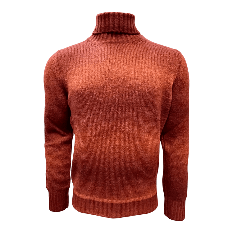 Leichter Rollkragenpullover von Gran Sasso mit warmem Farbverlauf zwischen Orange und Ziegelrot, gefertigt aus 70 % Schurwolle, 30 % Polyamid