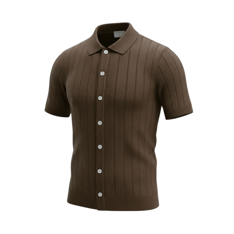 Dieses Kurzarm-Hemd von Never Laundry verbindet die Klarheit eines zeitlosen Basics mit der Raffinesse eines hochwertigen Feinstricks. Die Streifen sind nicht aufgedruckt, sondern entstehen durch ein verändertes Maschenbild – dadurch wirkt das Muster ruhiger, langlebiger und spürbar hochwertig. Der schokobraune Farbton ist bewusst nicht zu dunkel gewählt: warm, ausgewogen und vielseitig zu kombinieren, ob mit hellen Chinos, Denim oder sommerlichen Leinenhosen.