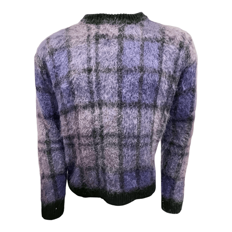 Dieser Rundhalspullover aus Merinowolle und Mohair vereint italienische Strickkunst mit ausdrucksstarkem Design. Das großflächige Karomuster in verschiedenen Lilatönen und Schwarz schafft eine markante, moderne Optik – elegant, aber mit modischer Energie.